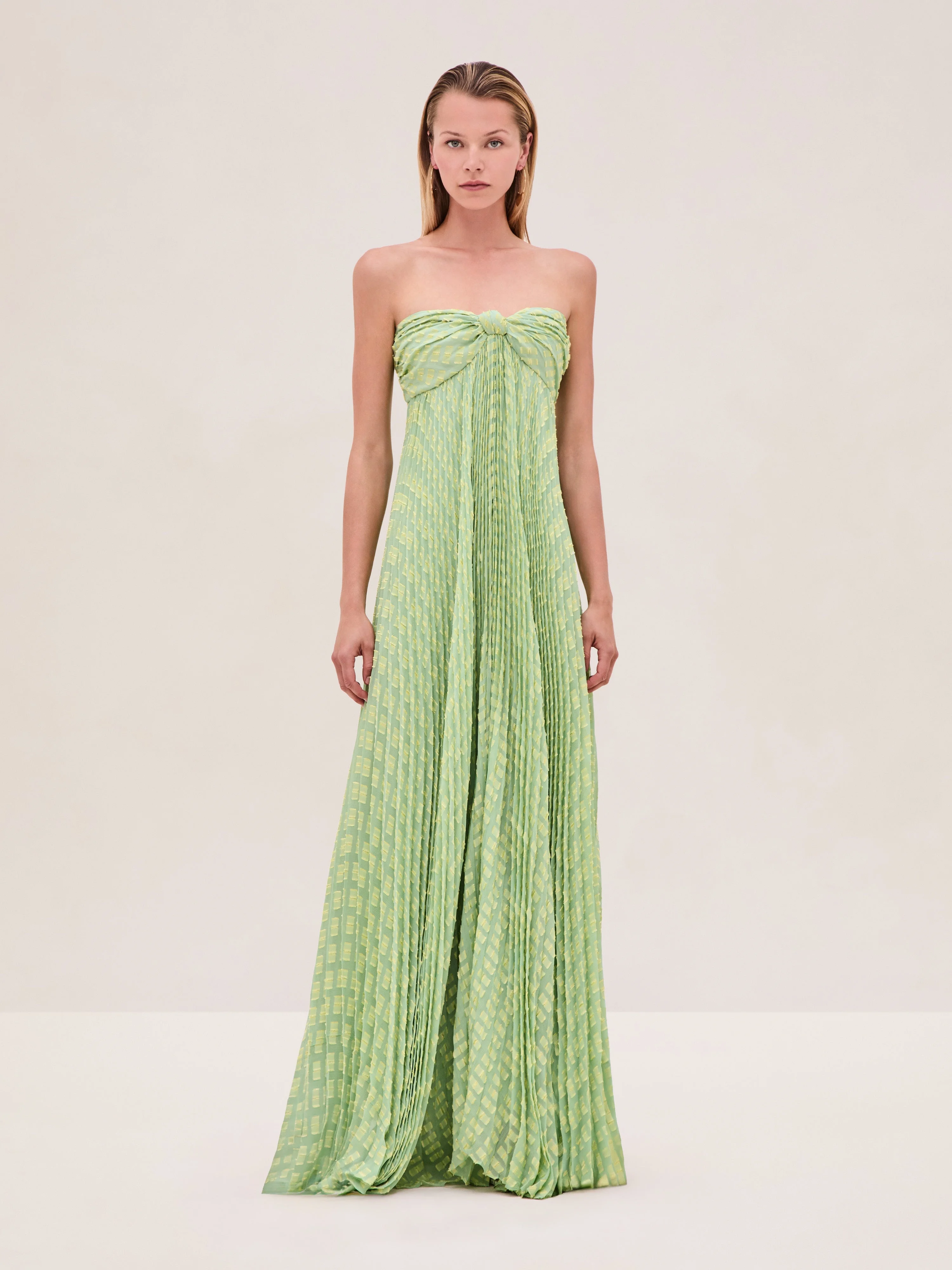 The Elea Dress is a printed pleated chiffon gown, designed with a strapless silhouette and a knot detail at the bust. Model Measurements Height: 5'11" Bust: 32 Waist: 24" Hips: 34” Model wears XS.