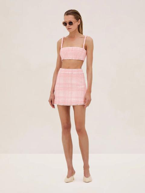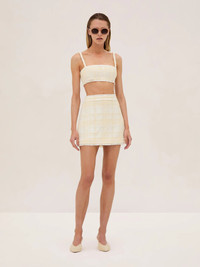 The Elma Skirt is a sleek tweed mini featuring clean lines and a tailored fit. It pairs seamlessly with the Estrada Top and Benning Jacket for a coordinated, polished look. Perfect for both day and evening wear, the Elma Skirt is a versatile piece that brings timeless style to any wardrobe. Model Measurements Height: 5'10" Bust: 34B Waist: 25" Hips: 35” Model wears an XS