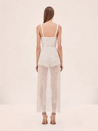 Intricately adorned with shimmering beads, the Escola Romper offers a modern twist on classic silhouette. The structured bodice flatters your silhouette while the detachable skirt adds a dramatic layer of elegance. Perfect for making a statement, wear it with or without the cape for a versatile and show-stopping ensemble. Model Measurements Height: 5'10" Bust: 34B Waist: 25" Hips: 35” Model wears an XS