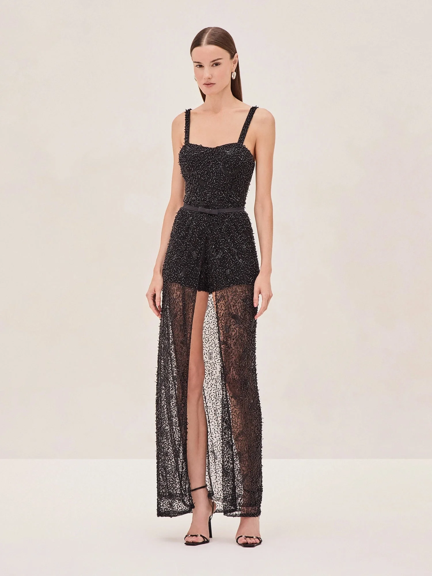 Intricately adorned with shimmering beads, the Escola Romper offers a modern twist on classic silhouette. The structured bodice flatters your silhouette while the detachable skirt adds a dramatic layer of elegance. Perfect for making a statement, wear it with or without the cape for a versatile and show-stopping ensemble. Model Measurements Height: 5'10" Bust: 34B Waist: 25" Hips: 35” Model wears an XS