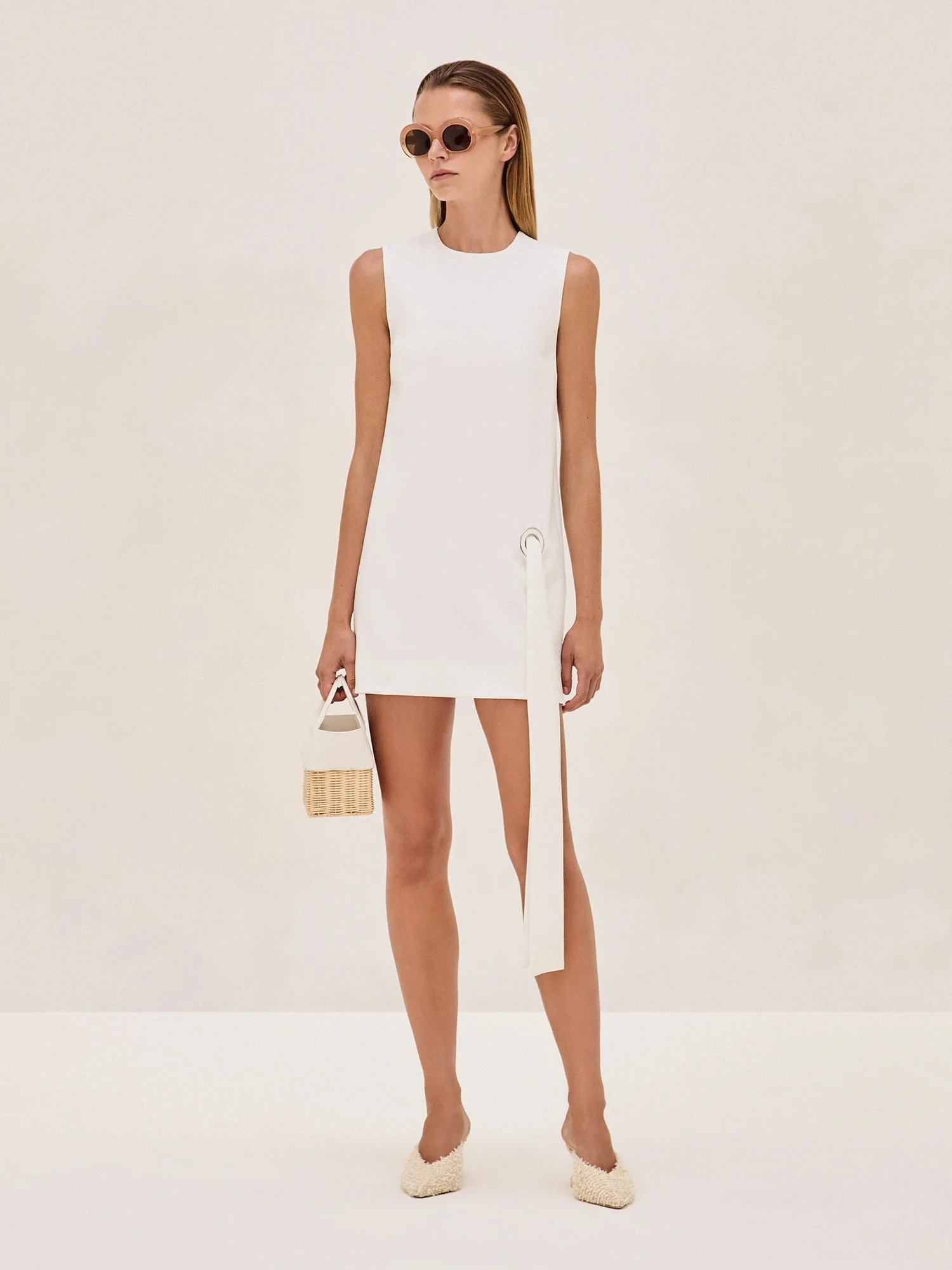 The Eyden Dress is a classic shift style with a modern twist. Designed in a sleek, sleeveless silhouette, it features a minimalist side tie detail that adds a touch of elegance. Perfect for daytime outings or evening events, this versatile dress pairs effortlessly with sandals or heels for a clean, polished look. Model Measurements Height: 5'10" Bust: 34B Waist: 25" Hips: 35” Model wears an XS