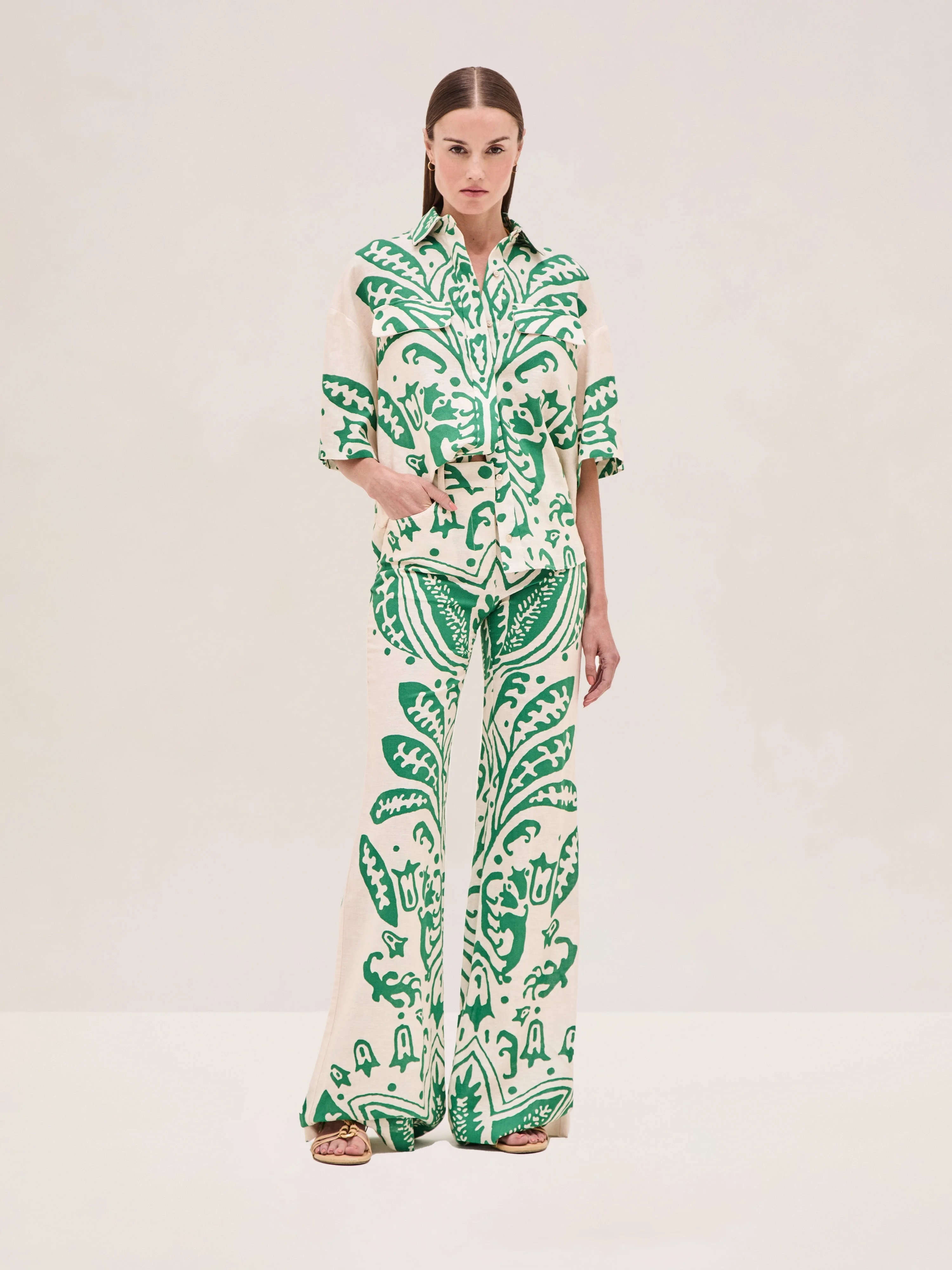 The Farad Top is a cotton linen blend printed button-down featuring front pocket details, paired with the Davi Pant. Model Measurements Height: 5'10" Bust: 34B Waist: 25" Hips: 35” Model wears an XS