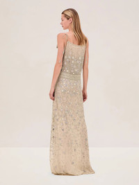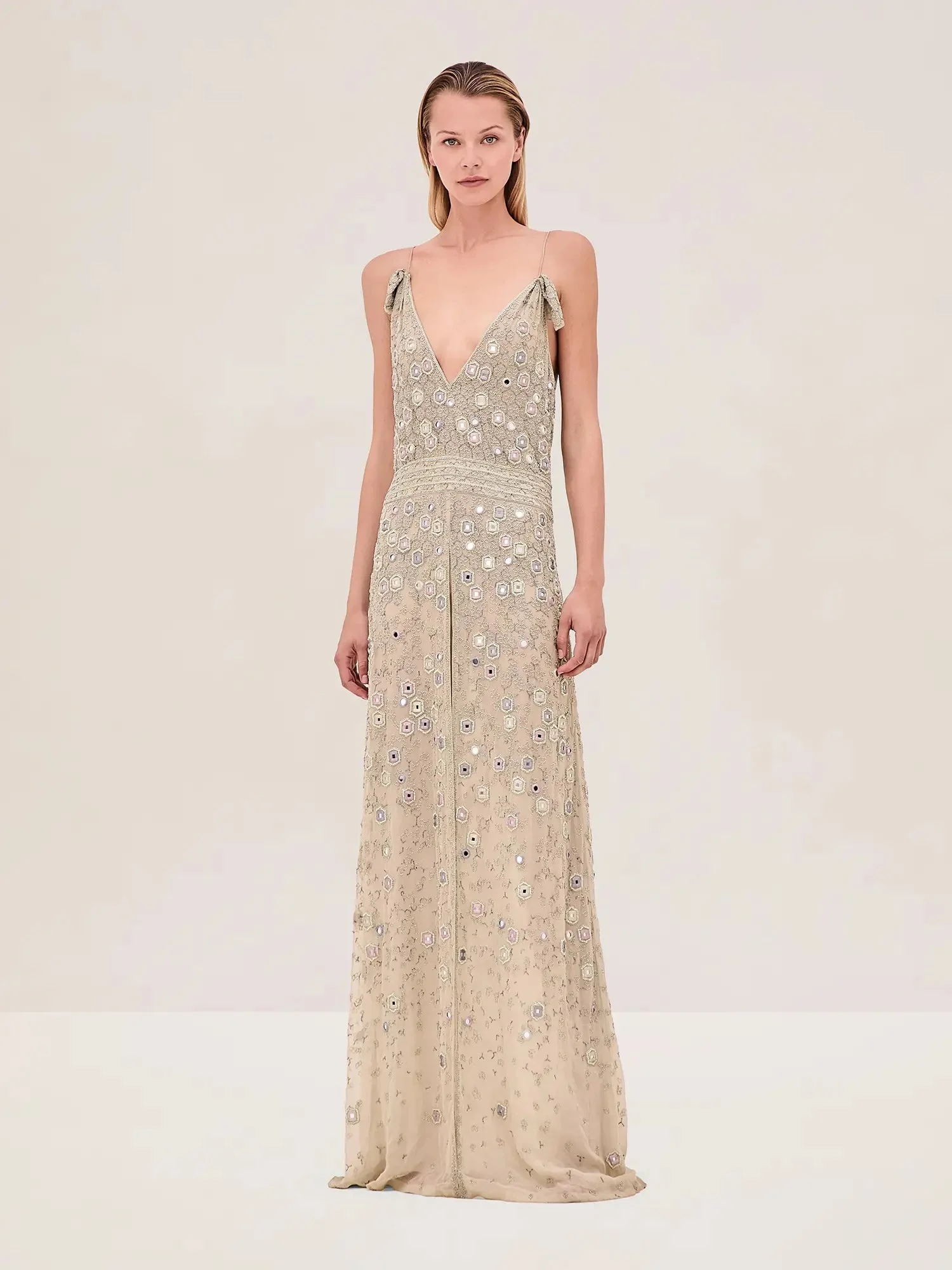 ONLINE EXCLUSIVE The Galeria Dress is designed with a plunging V-neckline and an intricately embellished bodice. The fitted silhouette flows into a floor-length skirt, featuring a thigh-high slit. Model Measurements Height: 5'11" Bust: 32 Waist: 24" Hips: 34” Model wears XS.