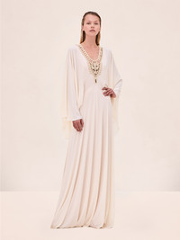 The Genevive Dress is a fluid crepe gown featuring a hand-beaded necklace at the neckline and long, flowy sleeves. Model Measurements Height: 5'10" Bust: 34B Waist: 25" Hips: 35” Model wears an XS