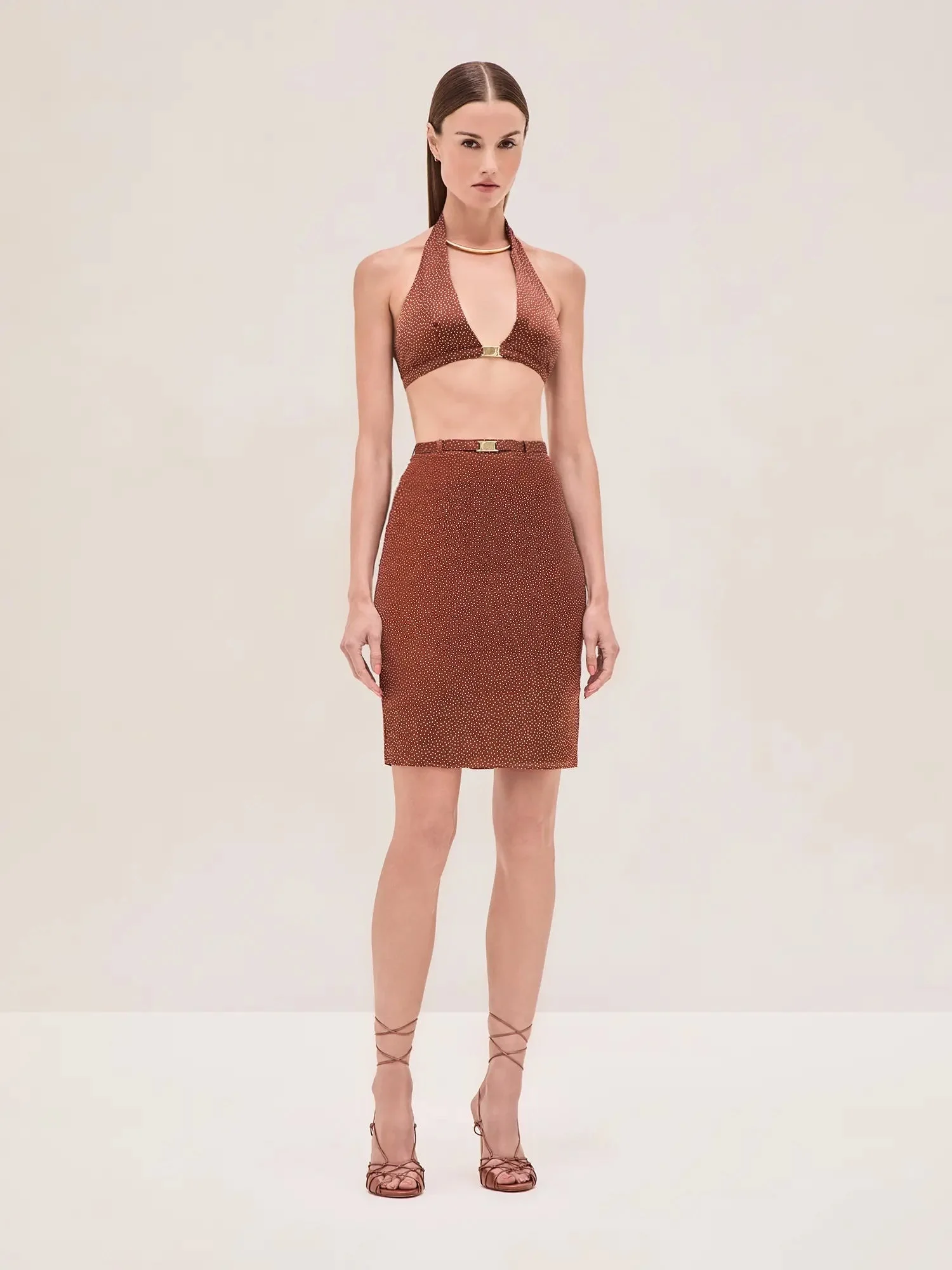 The Giotto Skirt is a fitted midi with a scrunched belt, paired with the Lotte Top. Model Measurements Height: 5'10" Bust: 34B Waist: 25" Hips: 35” Model wears an XS