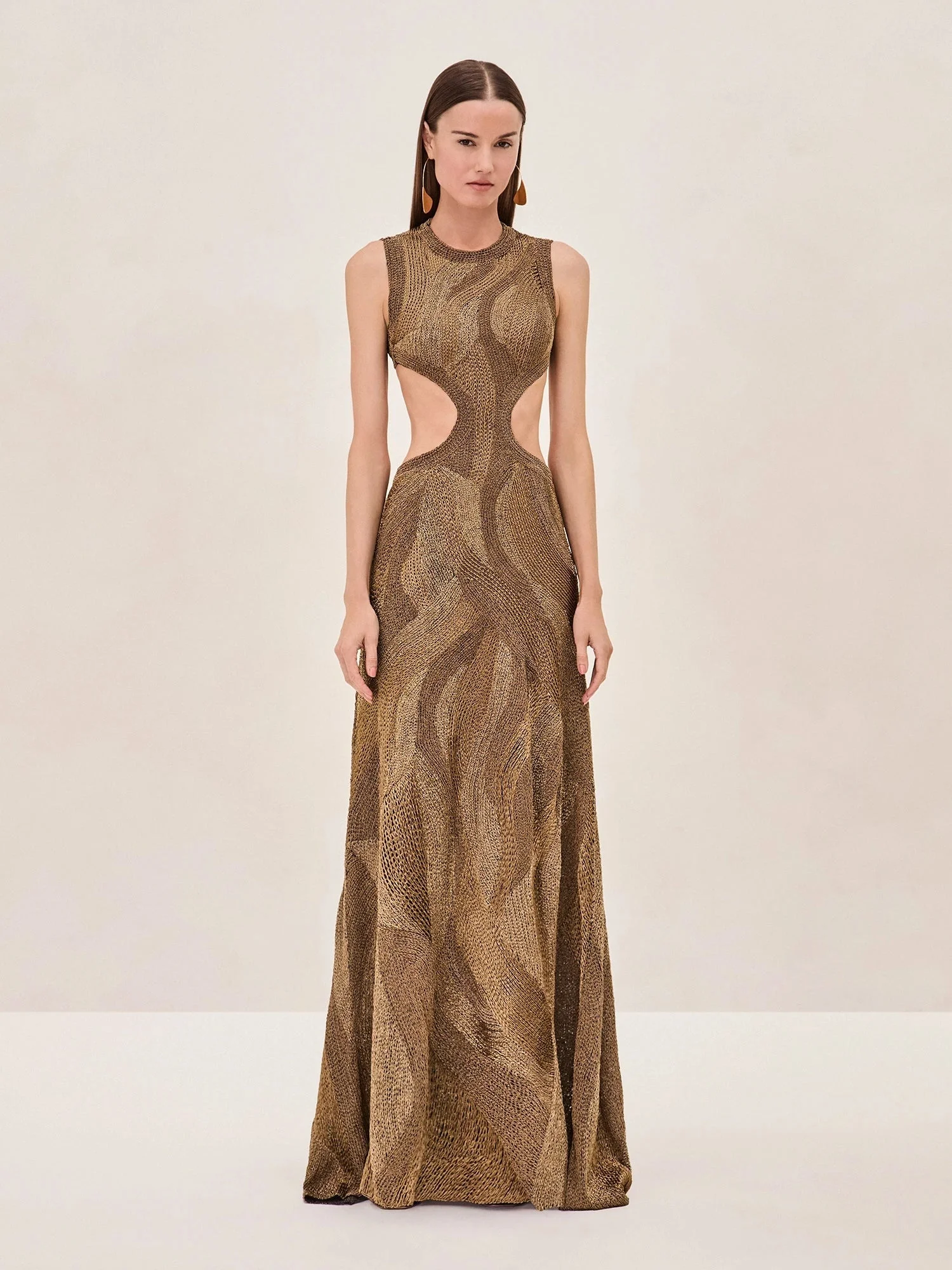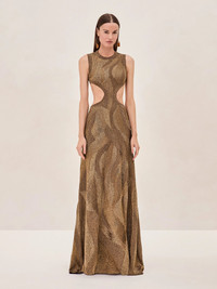 Introducing the Haven Dress – a masterclass in bold elegance. Sculpted to perfection, it hugs your curves with its chain-link texture, creating a look that’s both sleek and striking. With daring cutouts that accentuate the waist and a floor-length silhouette, it’s your ultimate statement piece. Model Measurements Height: 5'10" Bust: 34B Waist: 25" Hips: 35” Model wears an XS