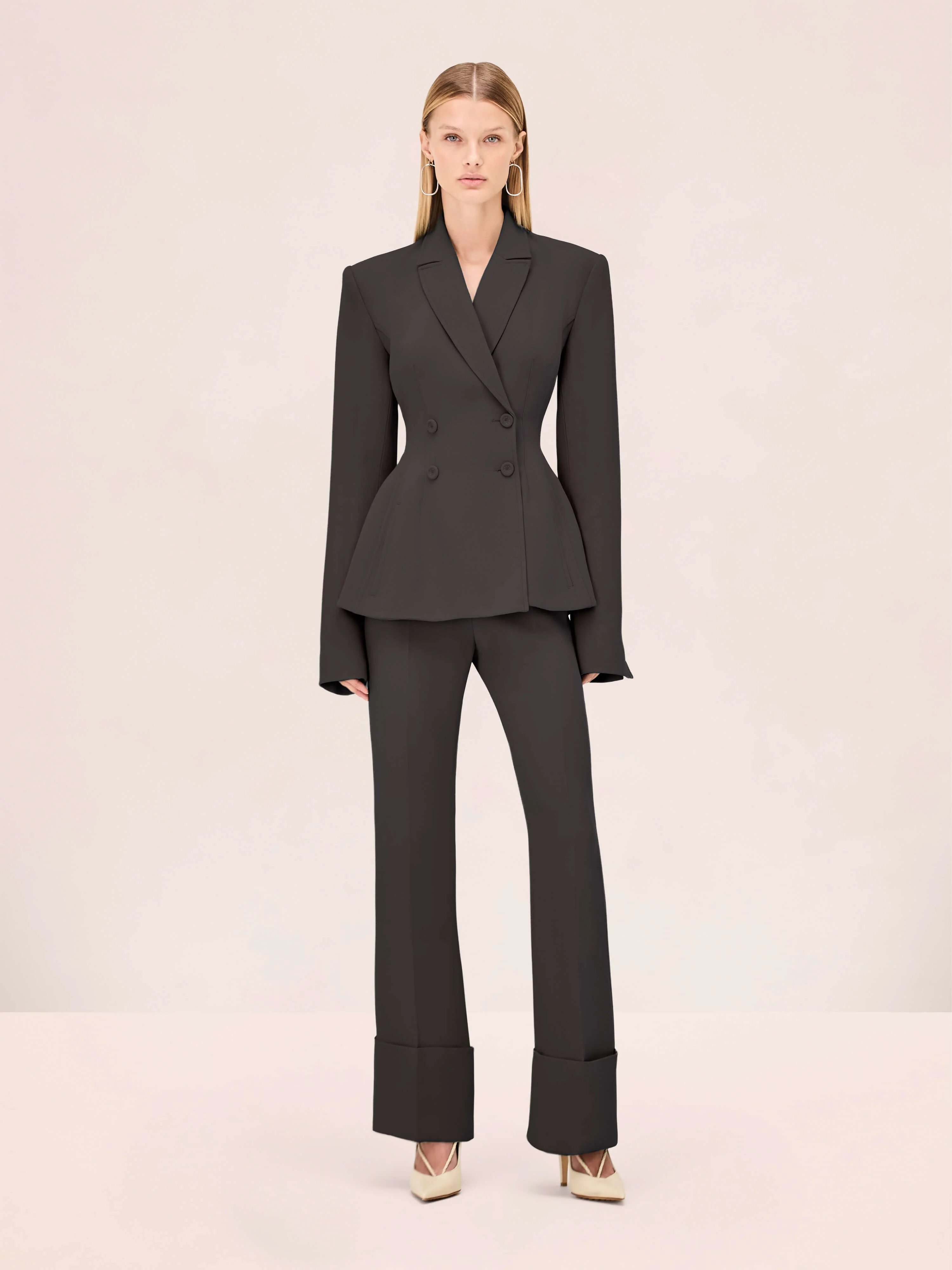 The Helen Jacket is a double-breasted fitted blazer, paired with the York Pant. Model Measurements Height: 5'10" Bust: 34B Waist: 25" Hips: 35” Model wears an XS
