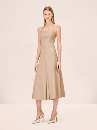 The Imena Dress is a halter-neck midi dress featuring a fitted bodice and front pleat detailing. Model Measurements Height: 5'10" Bust: 34B Waist: 25" Hips: 35” Model wears an XS