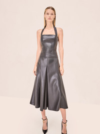 The Imena Dress is a halter-neck midi dress featuring a fitted bodice and front pleat detailing. Model Measurements Height: 5'10" Bust: 34B Waist: 25" Hips: 35” Model wears an XS