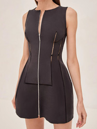 Introducing the Italie Dress, where sleek design meets undeniable sophistication. This mini dress is all about commanding attention with its structured silhouette and striking details. The zipper front adds a modern edge, while the tailored seams contour your figure for a flattering fit. Model wears XS Model Measurements Height: 5'10" Bust: 34B Waist: 25" Hips: 35”