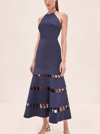 The Janessa Dress is a cotton halter midi design featuring cut-out ladder detailing. Model Measurements Height: 5'10" Bust: 34B Waist: 25" Hips: 35” Model wears an XS