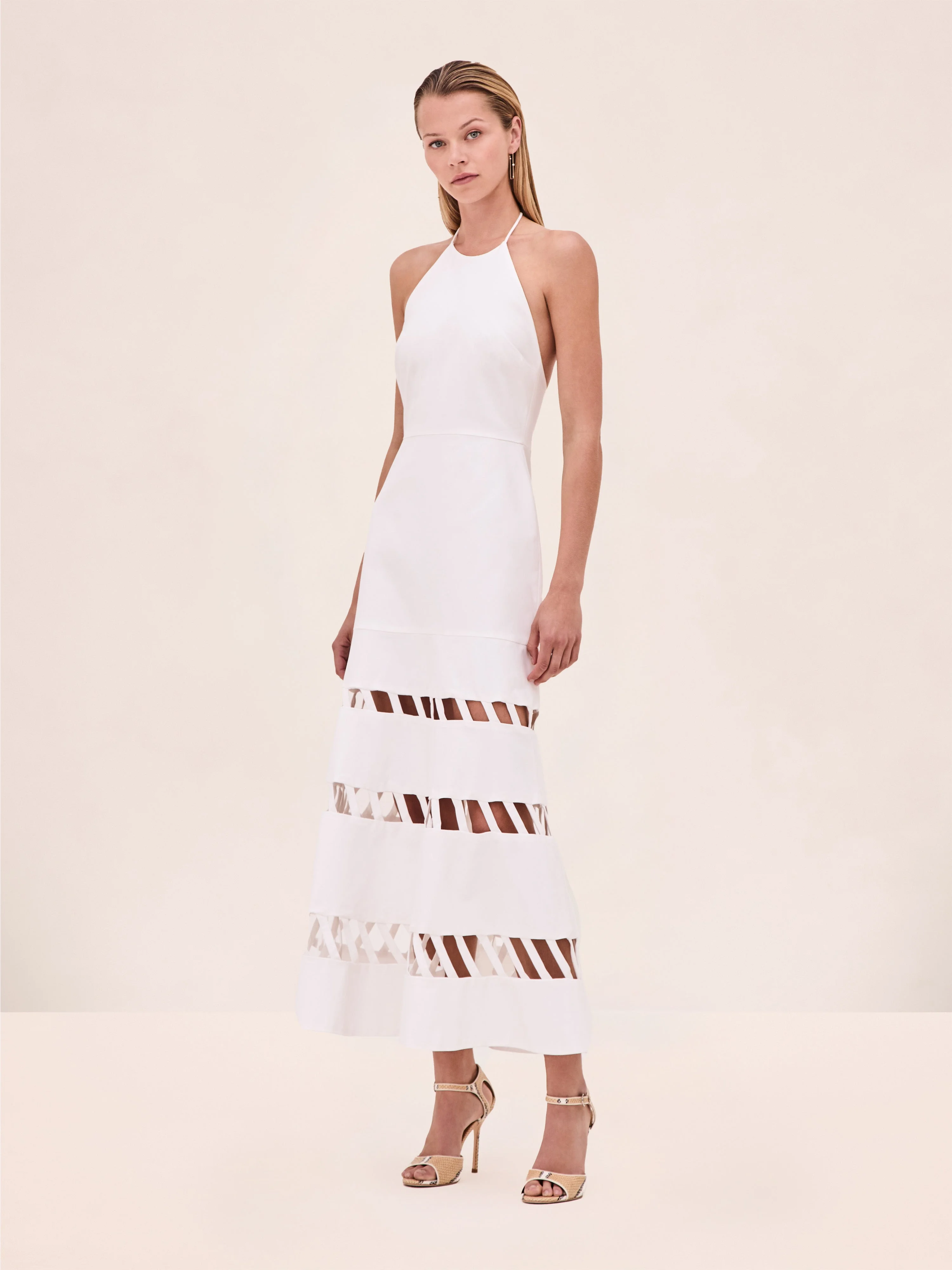The Janessa Dress is a cotton halter midi design featuring cut-out ladder detailing. Model Measurements Height: 5'10" Bust: 34B Waist: 25" Hips: 35” Model wears an XS