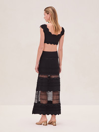 The Jeannie Skirt is a scalloped trim knit skirt featuring lace inserts, paired with the Lise Top. Model Measurements Height: 5'10" Bust: 34B Waist: 25" Hips: 35” Model wears an XS