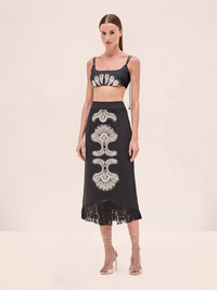 The Jenan Skirt is an embroidered midi skirt featuring intricate detailing and a raffia trim at the hem, paired with the Genga Top. Model Measurements Height: 5'10" Bust: 34B Waist: 25" Hips: 35” Model wears an XS