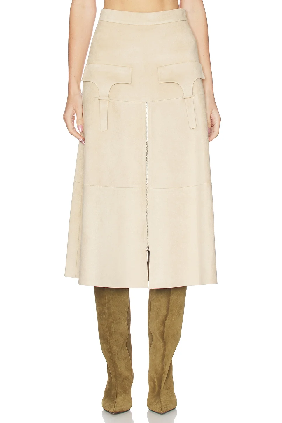 - Self: 90% polyester 10% elastane Lining: 100% polyester - Dry clean only - Unlined - Hidden side zip closure - Front faux flap pockets and zip detailing - Heavyweight faux suede fabric - Item not sold as a set - Skirt measures approx 32" in length - Revolve Style No. AXIS-WQ169 - Manufacturer Style No. A3250907-0782