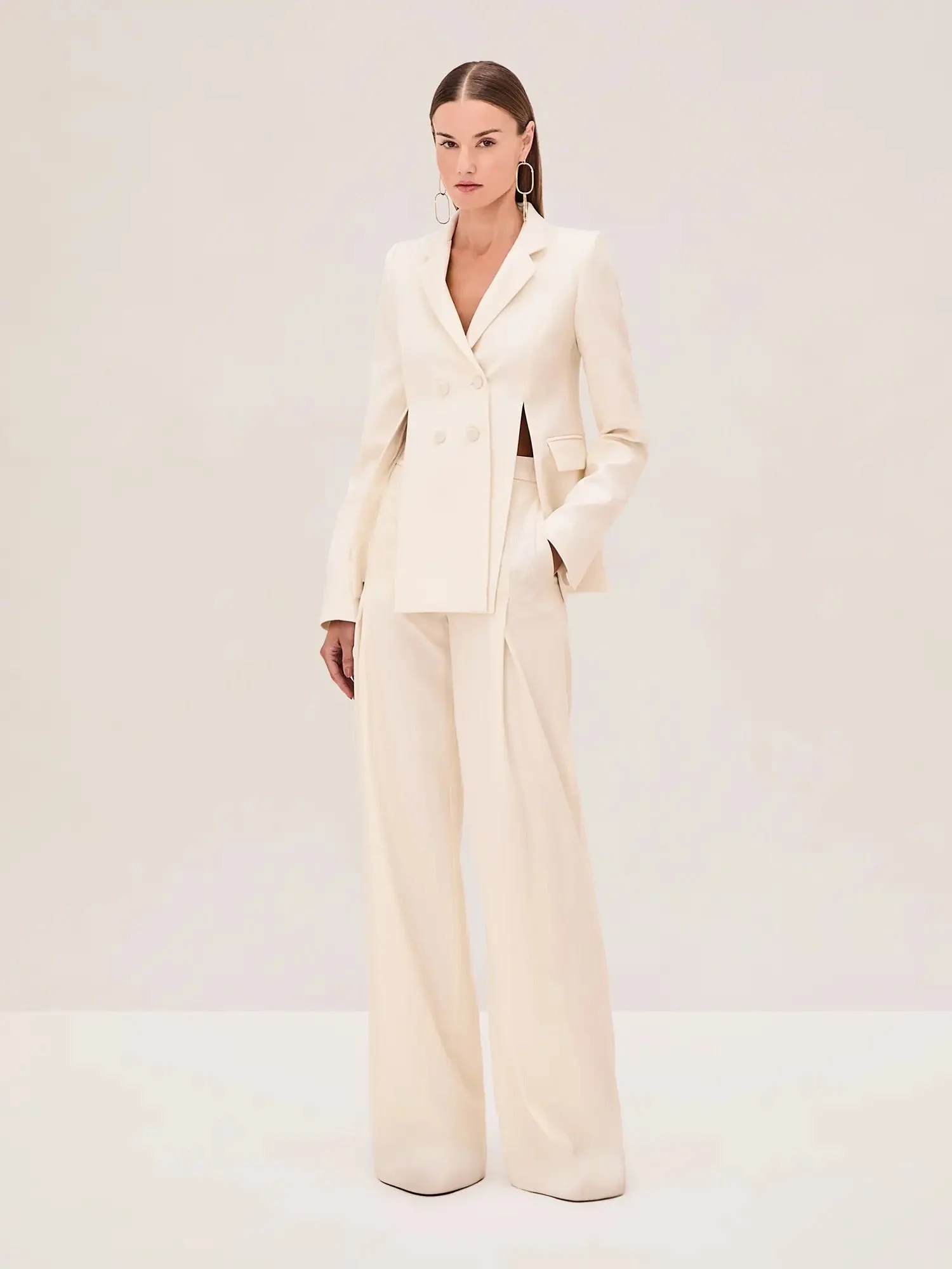 The Joaquin Jacket is a structured double-breasted blazer featuring front slits and flap pockets. Model Measurements Height: 5'10" Bust: 34B Waist: 25" Hips: 35” Model wears an XS