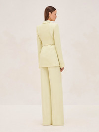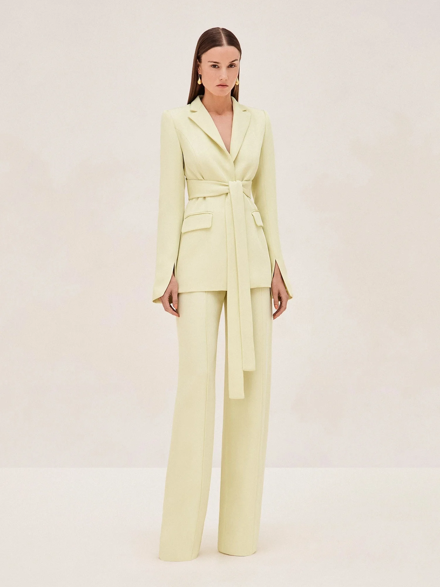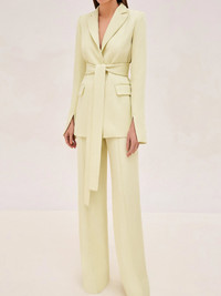 The Journey Blazer embodies sleek tailoring. Designed with peaked lapels and structured shoulders, this blazer comes with a sash belt that adjusts to synch your waist. Style with the matching Rex Pants for a sleek look. Model Measurements Height: 5'10" Bust: 34B Waist: 25" Hips: 35” Model wears an XS