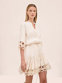 The Kalia Dress is a mini silhouette featuring circular cutout detailing and a tasseled rope belt. Read more Model Measurements Height: 5'10" Bust: 34B Waist: 25" Hips: 35” Model wears an XS Read more