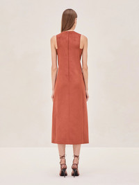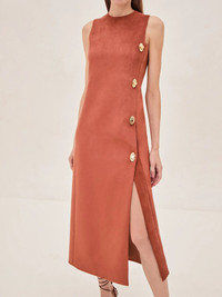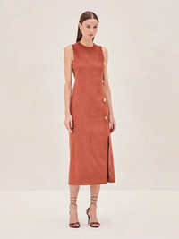 Meet the Kalita Vegan Suede Midi Dress – a modern minimalist’s dream. Crafted in luxe vegan suede, this rust-hued stunner effortlessly combines structure and softness. The sleek silhouette is elevated with gold-tone buttons along the side, offering just the right amount of edge with its slit. Model Measurements Height: 5'10" Bust: 34B Waist: 25" Hips: 35”