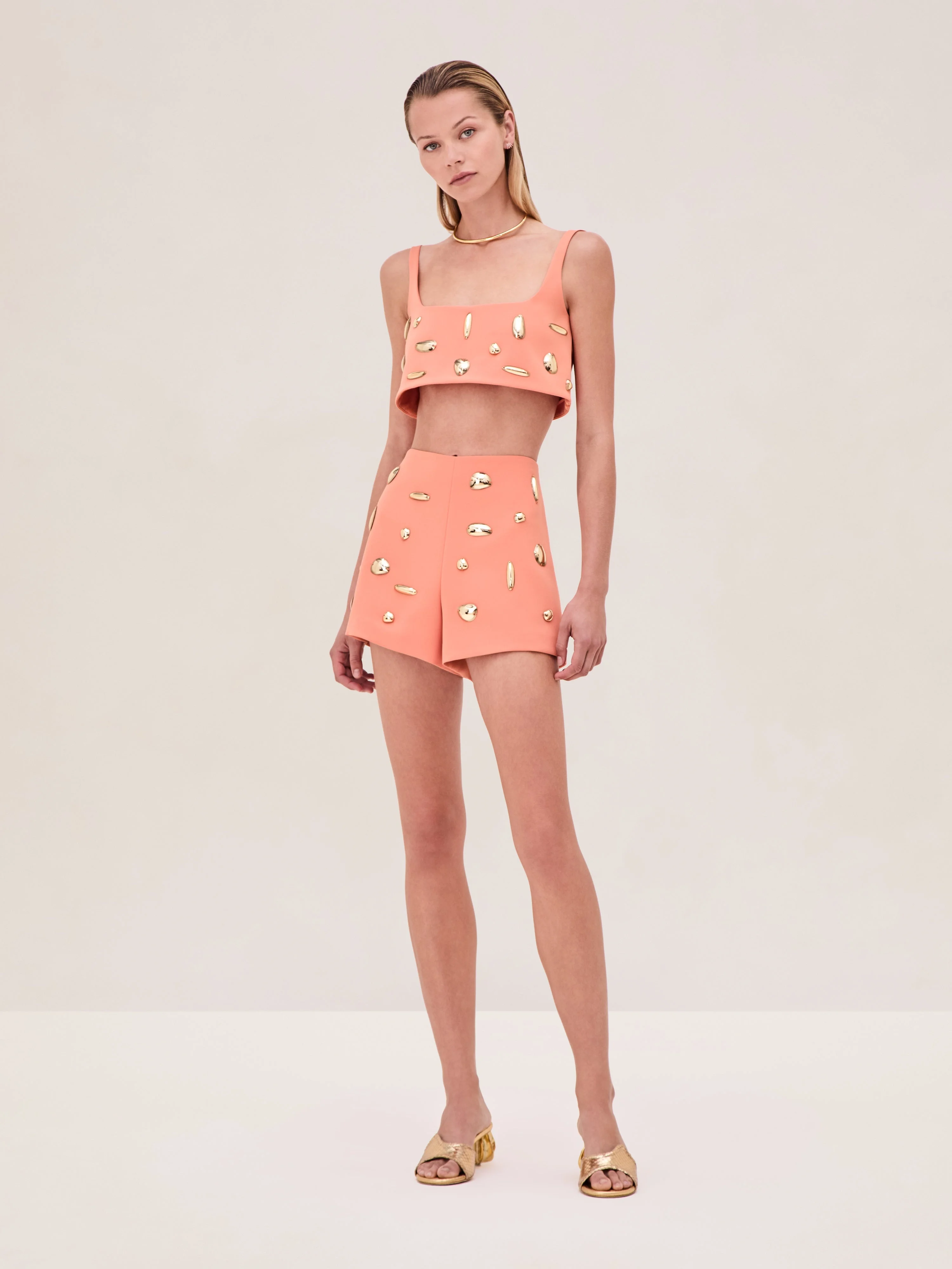 The Kanya Short is a h igh-waisted short with hand-sewn gold applique details, paired with the Lya Top. Model Measurements Height: 5'10" Bust: 34B Waist: 25" Hips: 35” Model wears an XS