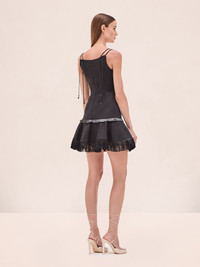 The Kikie Dress is an embroidered mini dress featuring intricate floral detailing with raffia trim at the hem. Model Measurements Height: 5'10" Bust: 34B Waist: 25" Hips: 35” Model wears an XS