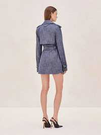 The Knoxx Coat dress is fused with a functional sensuality that stands the test of time. Cut in a structured denim, this versatile piece features a wide lapel, a belted waist belt, oversized pockets and belted cuff sleeves. Model wears XS Model Measurements Height: 5'10" Bust: 34B Waist: 25" Hips: 35”