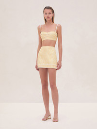 The Kwon Skirt is a high waisted mini skirt featuring a textured design with subtle shine, paired with the Evie Top. Model Measurements Height: 5'10" Bust: 34B Waist: 25" Hips: 35” Model wears an XS