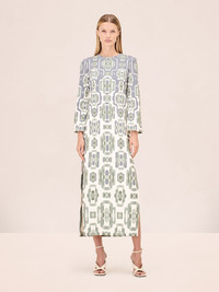 The Larissa Dress is a long-sleeve midi dress featuring a geometric print, a straight silhouette, and side slit detailing. Model Measurements Height: 5'10" Bust: 34B Waist: 25" Hips: 35” Model wears an XS