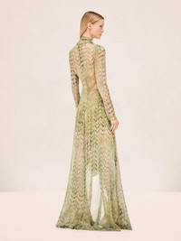 The Lexia Dress is a long sleeve maxi featuring a high neckline with scarf tie detail, a sheer overlay, and a gathered waist with a side slit. Model Measurements Height: 5'10" Bust: 34B Waist: 25" Hips: 35” Model wears an XS