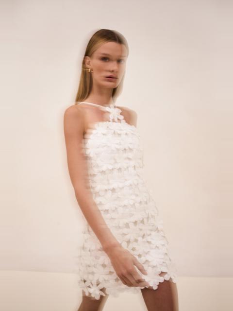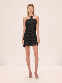 The Lily Dress is a halter mini silhouette featuring 3D floral detailing throughout. Model Measurements Height: 5'10" Bust: 34B Waist: 25" Hips: 35” Model wears an XS