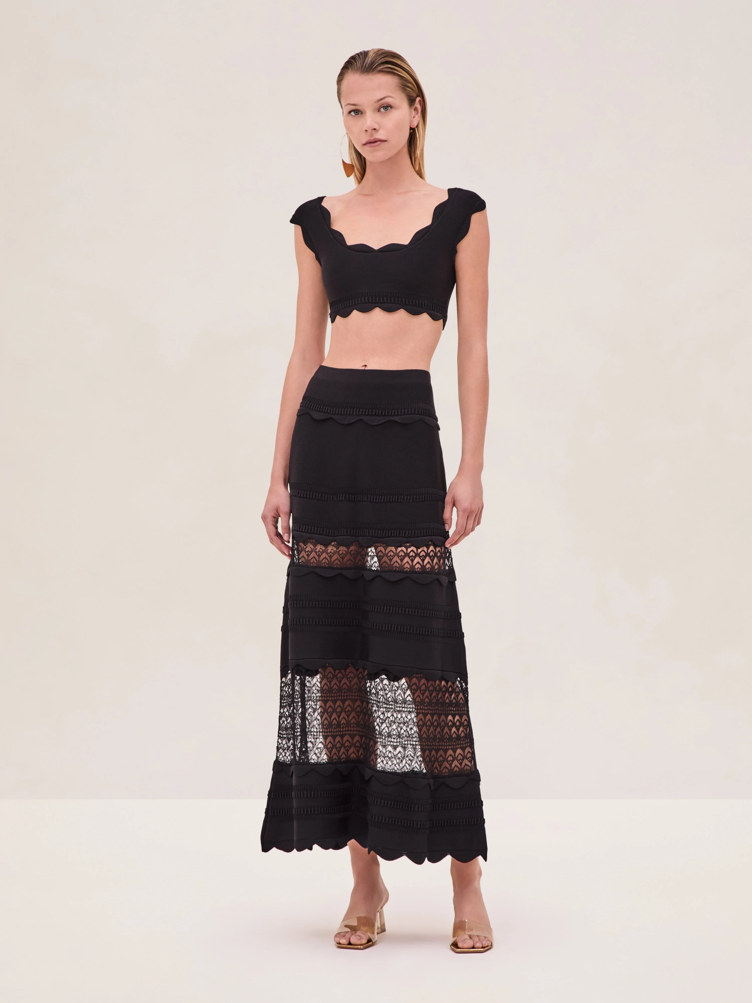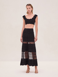 The Lise Top is a scalloped trim knit top, paired with the Jeanne Skirt. Model Measurements Height: 5'10" Bust: 34B Waist: 25" Hips: 35” Model wears an XS