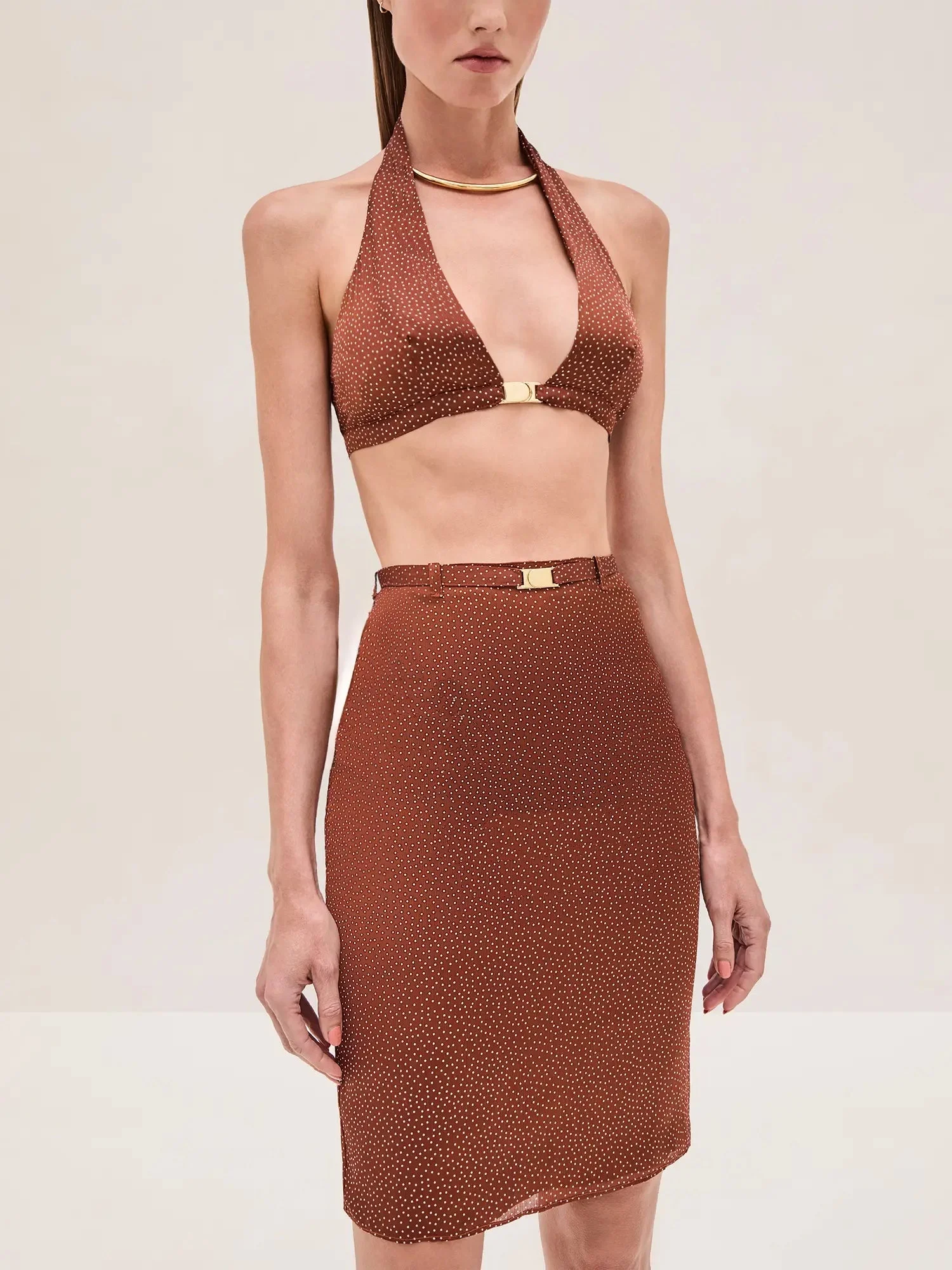 The Lotte Top is a halter crop top with a gold metal closure at the neck, paired with the Giotto Skirt. Model Measurements Height: 5'11" Bust: 32 Waist: 24" Hips: 34” Model wears XS.