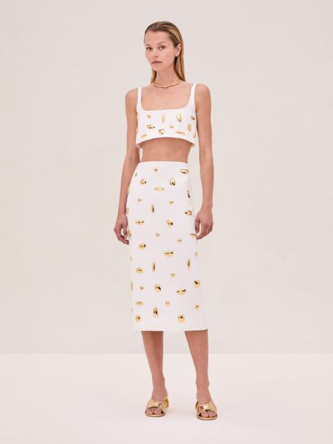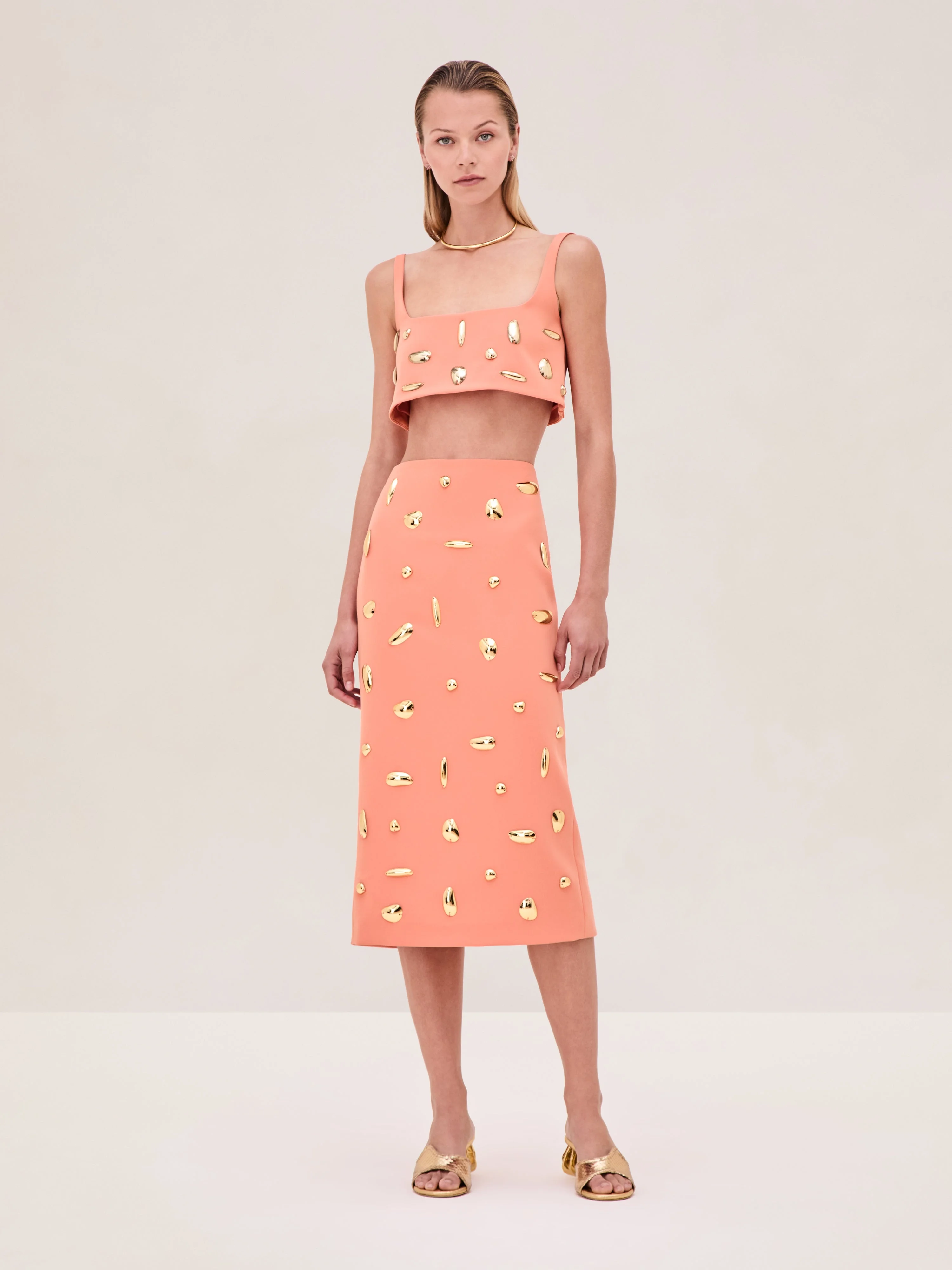 The Lya Top is a crepe crop top with gold hand-sewn appliques, paired with the Kanya Short and Pamila Skirt. Model Measurements Height: 5'10" Bust: 34B Waist: 25" Hips: 35” Model wears an XS
