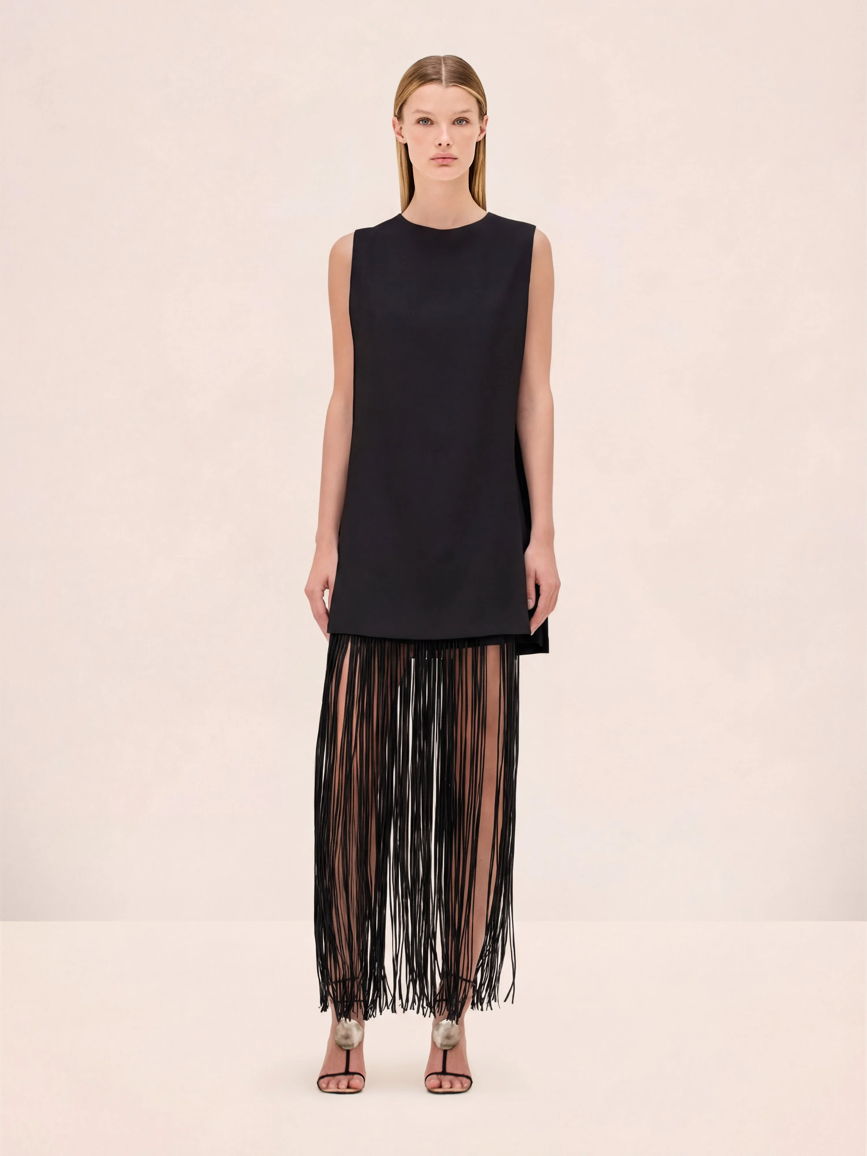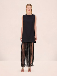 The Mackenzie Dress is a sleeveless mini shift dress featuring an attachable fringe skirt overlay. Model Measurements Height: 5'10" Bust: 34B Waist: 25" Hips: 35” Model wears an XS