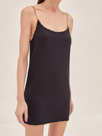 This sleek black mini is adorned with delicate gold chain detailing along the neckline and hem, adding a touch of edge to its minimalist design. This flattering silhouette, that can be cinched with the Macchi belt, perfectly balances elegance and allure. Styled with our Macchi Belt, sold separately. Model Measurements Height: 5'10" Bust: 34B Waist: 25" Hips: 35”