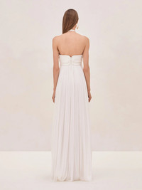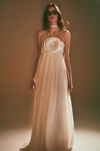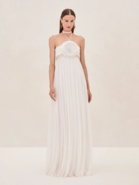 The Mallorie Gown features a delicate halter neckline and a beautifully pleated skirt that flows effortlessly with each step. The centerpiece of the gown is the intricate floral embellishment at the bodice, adding a touch of romantic sophistication to this timeless silhouette. Model Measurements Height: 5'10" Bust: 34B Waist: 25" Hips: 35”
