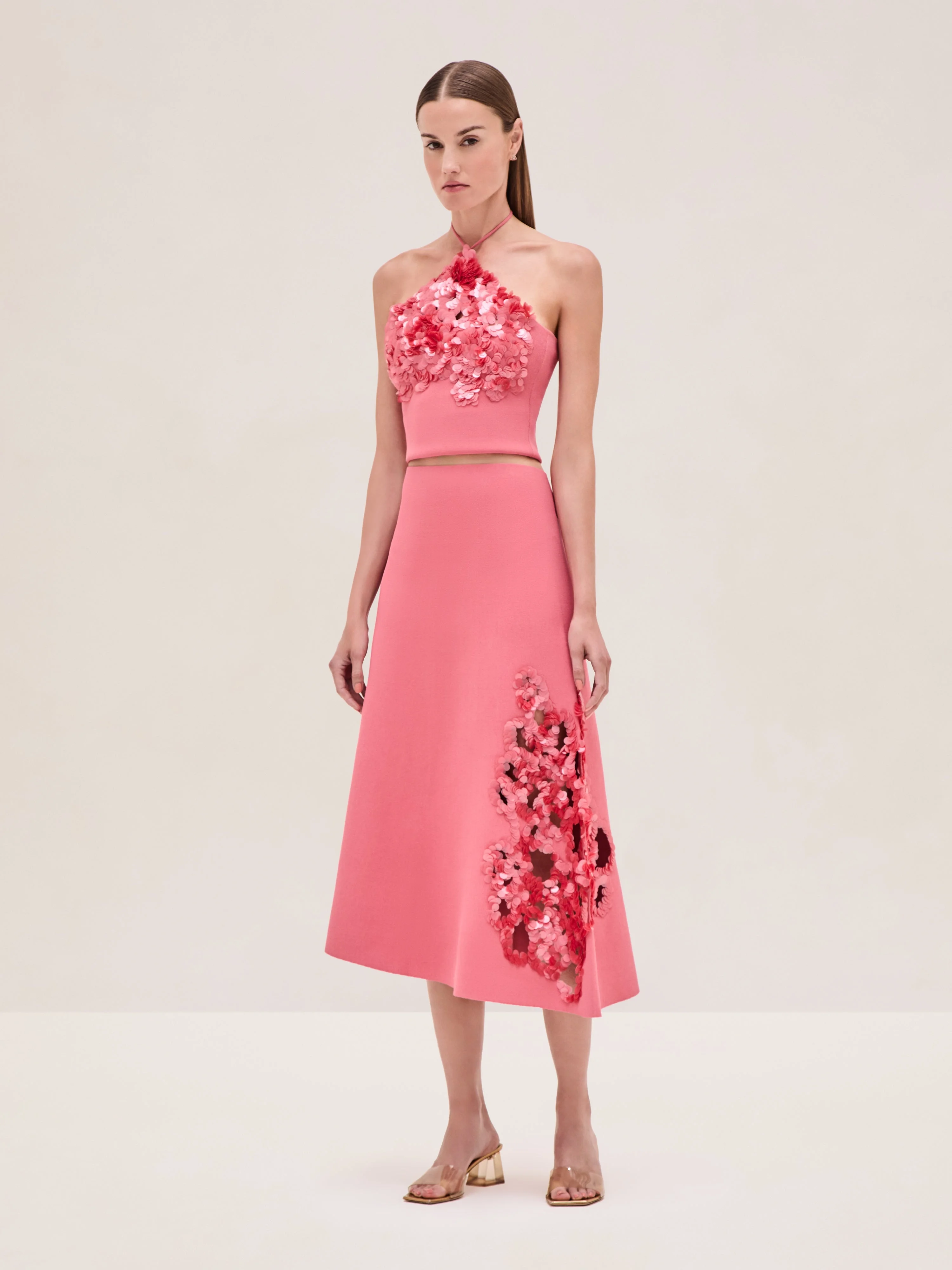 The Maris Skirt is a knit midi skirt with cut-out sequin details, paired with the Relle Top. Model Measurements Height: 5'10" Bust: 34B Waist: 25" Hips: 35” Model wears an XS