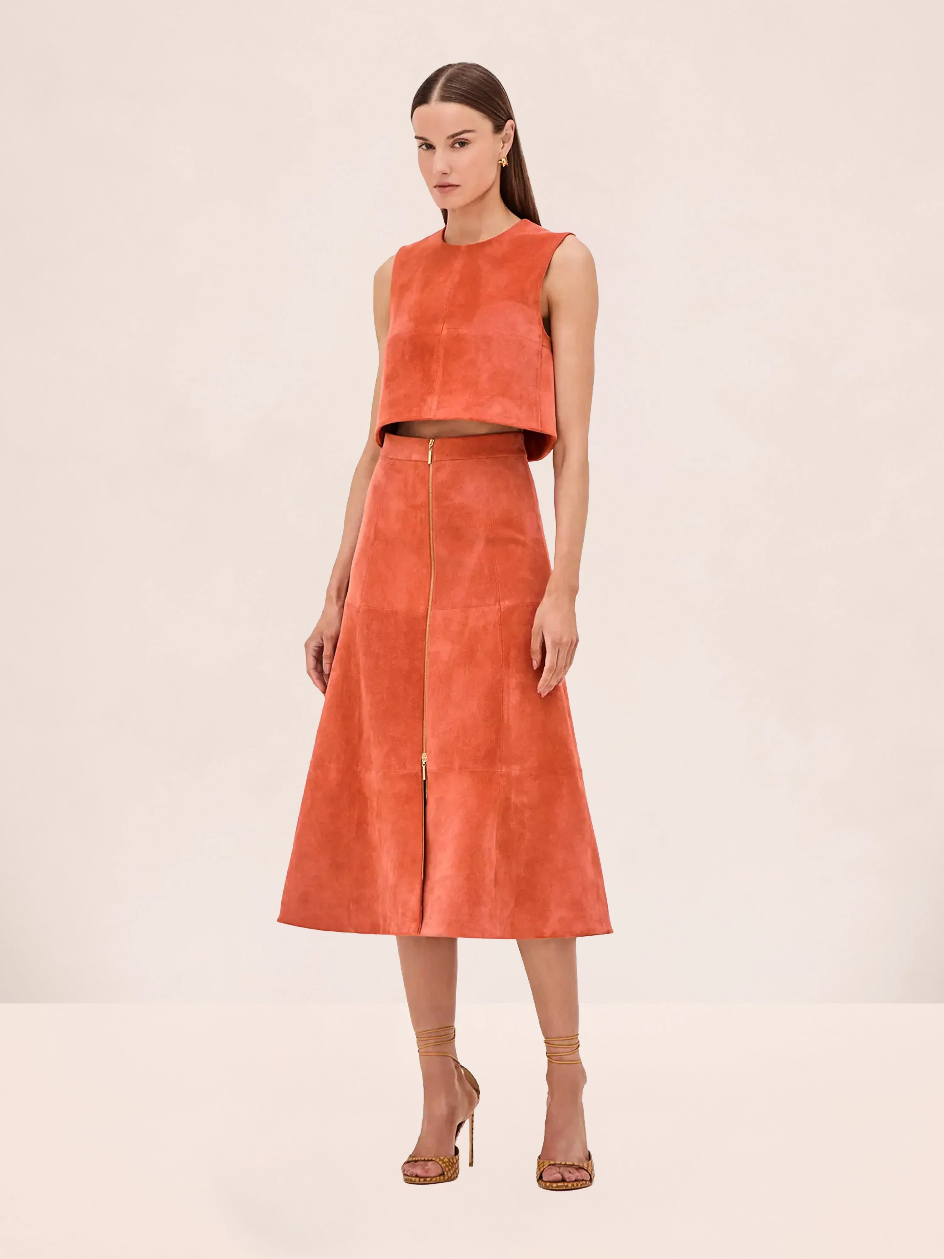 The Marni Top is a sleeveless crop silhouette featuring a clean, structured shape, paired with the Bently Skirt. Model Measurements Height: 5'10" Bust: 34B Waist: 25" Hips: 35” Model wears an XS