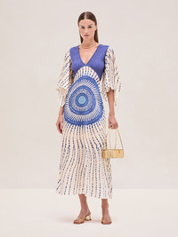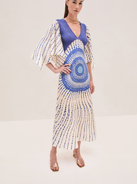 The Matani Dress features a striking sunburst motif and a flowing silhouette. Designed with a plunging V-neckline and flutter sleeves. Model Measurements Height: 5'10" Bust: 34B Waist: 25" Hips: 35” Model wears an XS