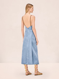 The Melina Dress is a suede midi dress with adjustable buckle straps and a belted waist. Model Measurements Height: 5'10" Bust: 34B Waist: 25" Hips: 35” Model wears an XS