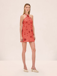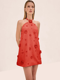 The Milaa Dress is a halter mini silhouette featuring 3D floral appliques throughout. Model Measurements Height: 5'10" Bust: 34B Waist: 25" Hips: 35” Model wears an XS