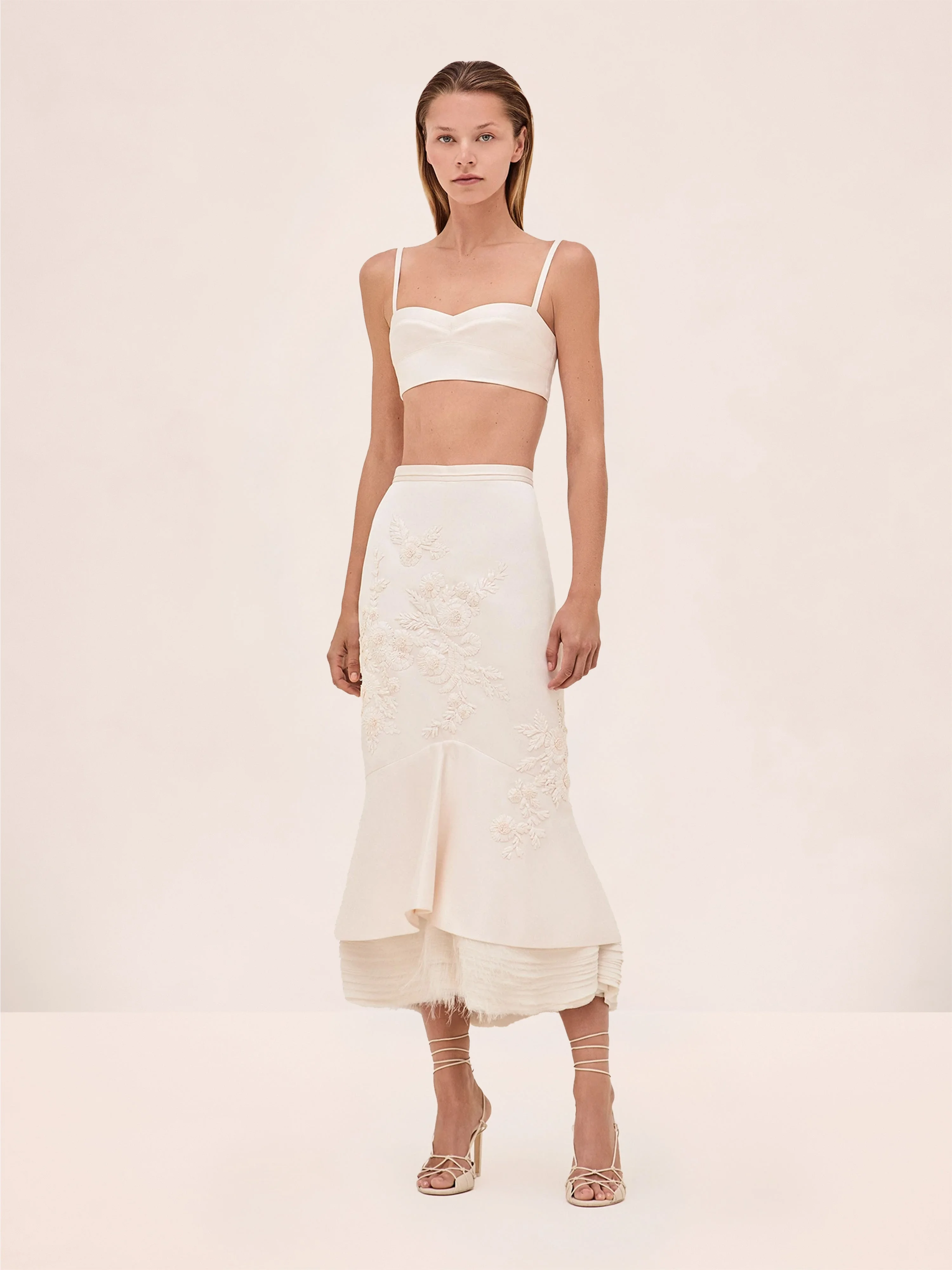 The Mili Top features delicate straps and a sweetheart neckline, offering a blend of sophistication and support. This tailored design pairs effortlessly with the Kiernan Skirt for a polished, elegant look. Model Measurements Height: 5'10" Bust: 34B Waist: 25" Hips: 35” Model wears an XS