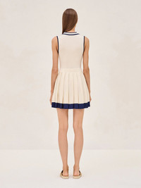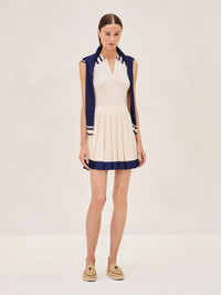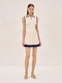 The Moritz Dress is a playful yet polished choice, perfect for when you want to look put together with a sporty twist. Its rich ivory color is striking, and the crisp marine blue trim adds a fresh contrast. The collar and button details lend a nod to classic tennis attire, while the flared skirt keeps it fun and flirty. This dress is great for a weekend outing or a casual get-together. Model Measurements Height: 5'10" Bust: 34B Waist: 25" Hips: 35”