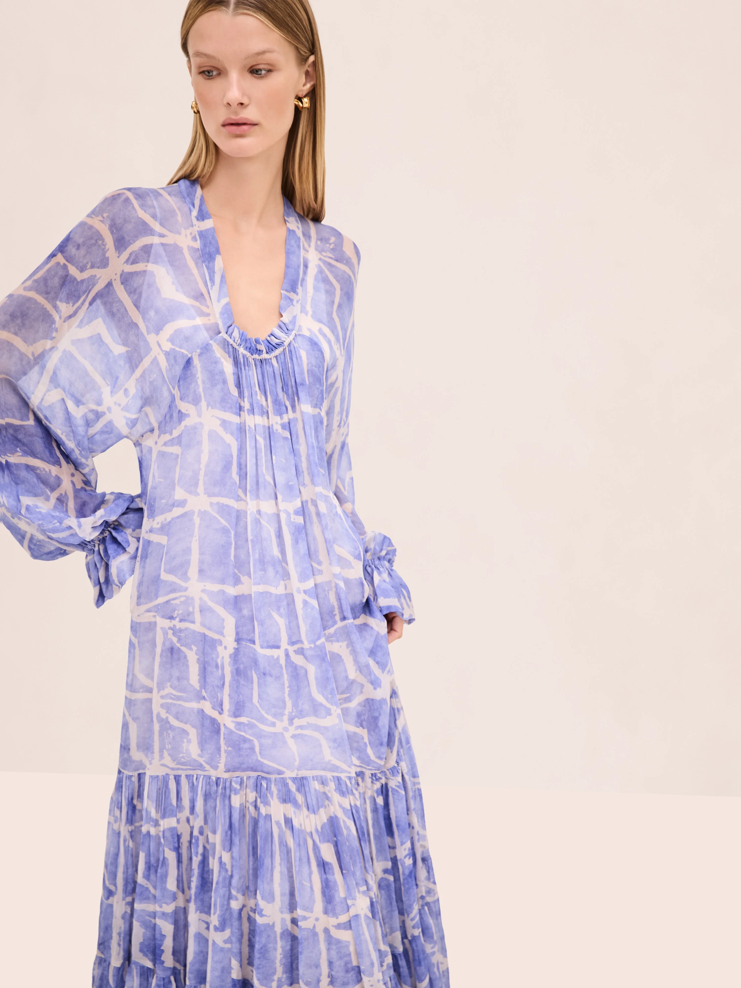 The Mykael Dress is a relaxed silhouette featuring a deep V neckline, tiered skirt, and abstract print. Model Measurements Height: 5'10" Bust: 34B Waist: 25" Hips: 35” Model wears an XS