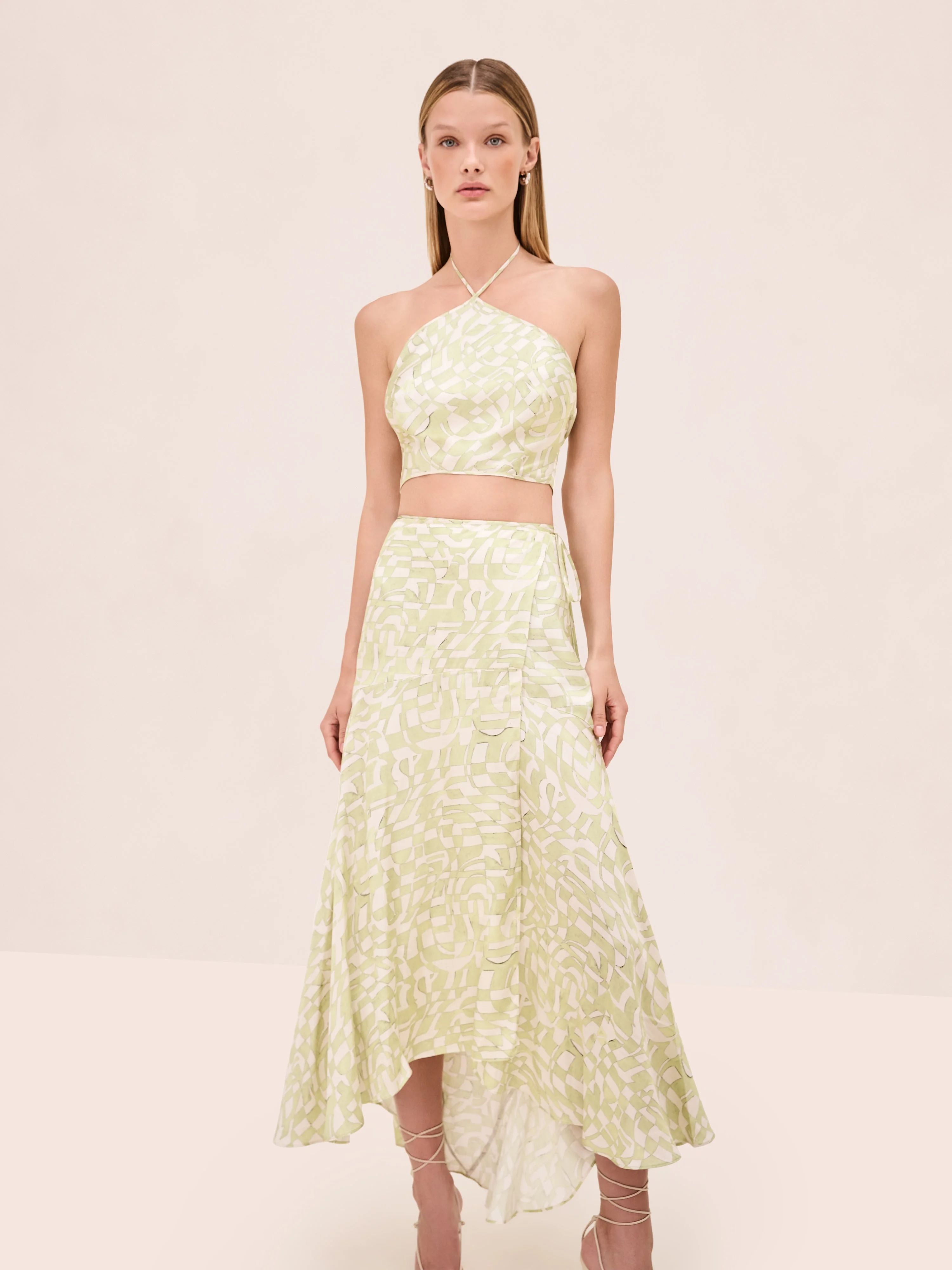 The Nali Top is a halter-style crop top featuring an abstract printed design, paired with the Alzena Skirt. Model Measurements Height: 5'10" Bust: 34B Waist: 25" Hips: 35” Model wears an XS