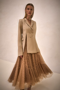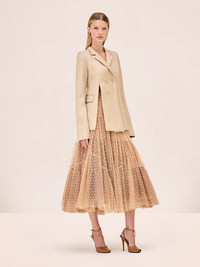 The Naomi Skirt is an A-line midi skirt crafted in sheer polka-dot lace with a voluminous, layered silhouette. Model Measurements Height: 5'10" Bust: 34B Waist: 25" Hips: 35” Model wears an XS