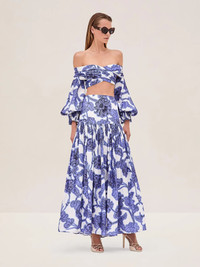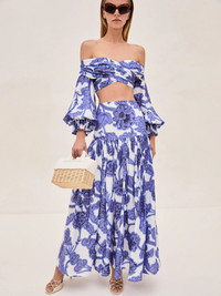 The Napoli Skirt is a flowy, feminine piece that makes a statement. With its vibrant blue floral print and tiered design, it moves beautifully and adds an effortless touch of elegance to your look. Pair it back with the Trisha Top for a stunning, coordinated outfit. Model Measurements Height: 5'11" Bust: 32 Waist: 24" Hips: 34” Model wears XS.