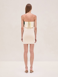 The Nava Dress is a strapless ribbed knit mini dress with a printed overlay at the top, finished with a fitted silhouette. Model Measurements Height: 5'10" Bust: 34B Waist: 25" Hips: 35” Model wears an XS