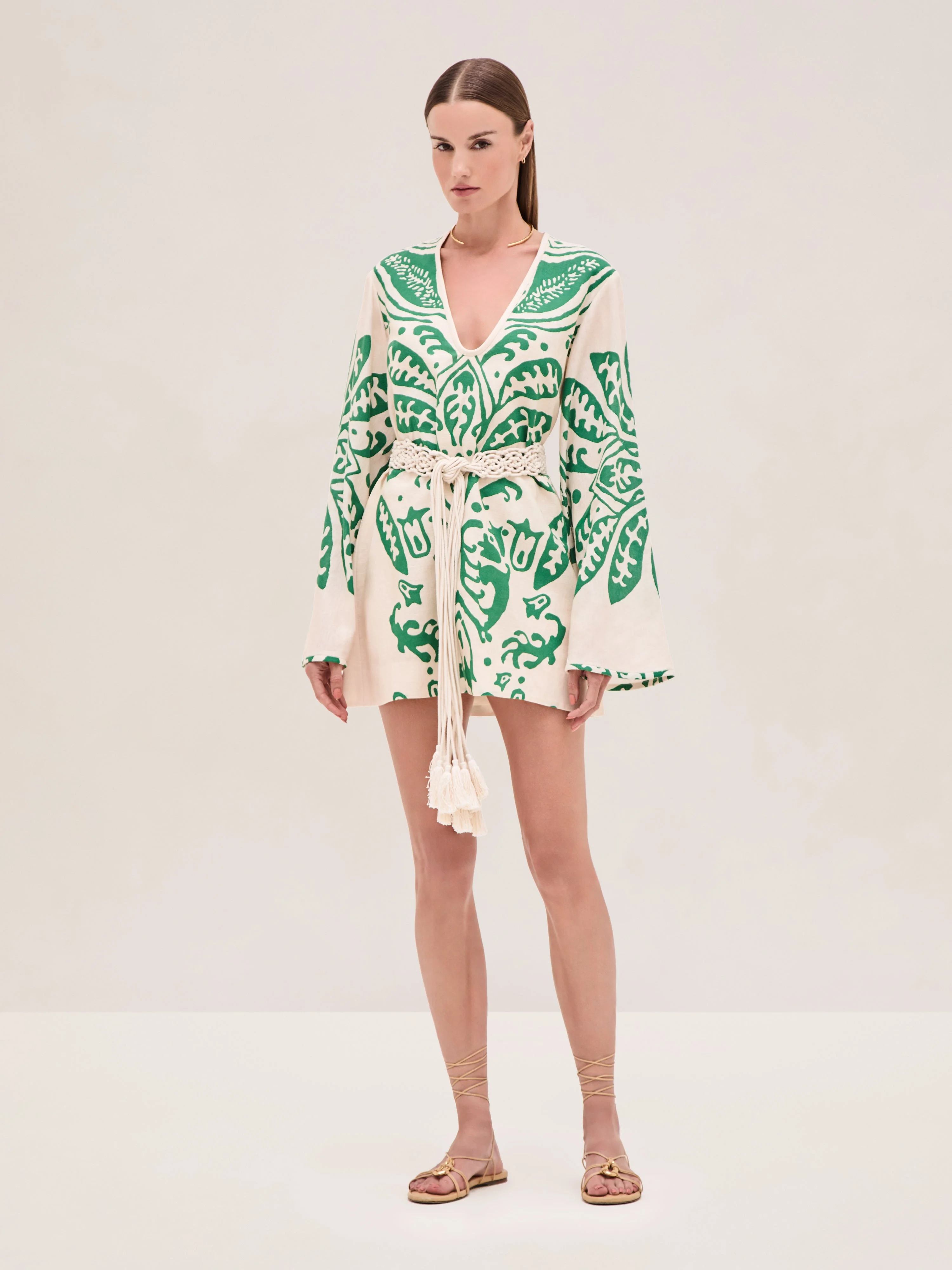 The Noriko Dress is a cotton-linen blend tunic dress featuring a removable macrame belt. Model Measurements Height: 5'10" Bust: 34B Waist: 25" Hips: 35” Model wears an XS