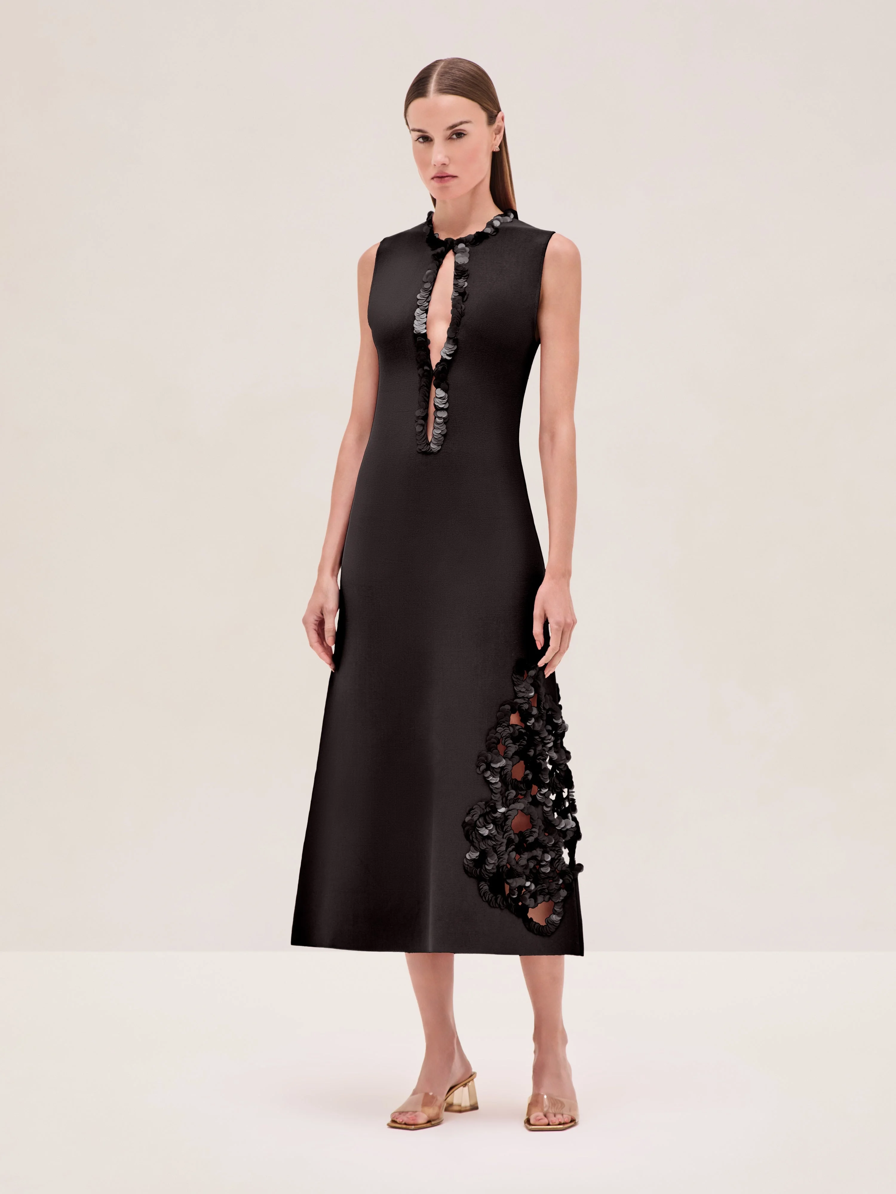 The Obarra Dress is a knit midi dress featuring intricate cut-out sequin detailing along the hem and neckline. Model Measurements Height: 5'10" Bust: 34B Waist: 25" Hips: 35” Model wears an XS